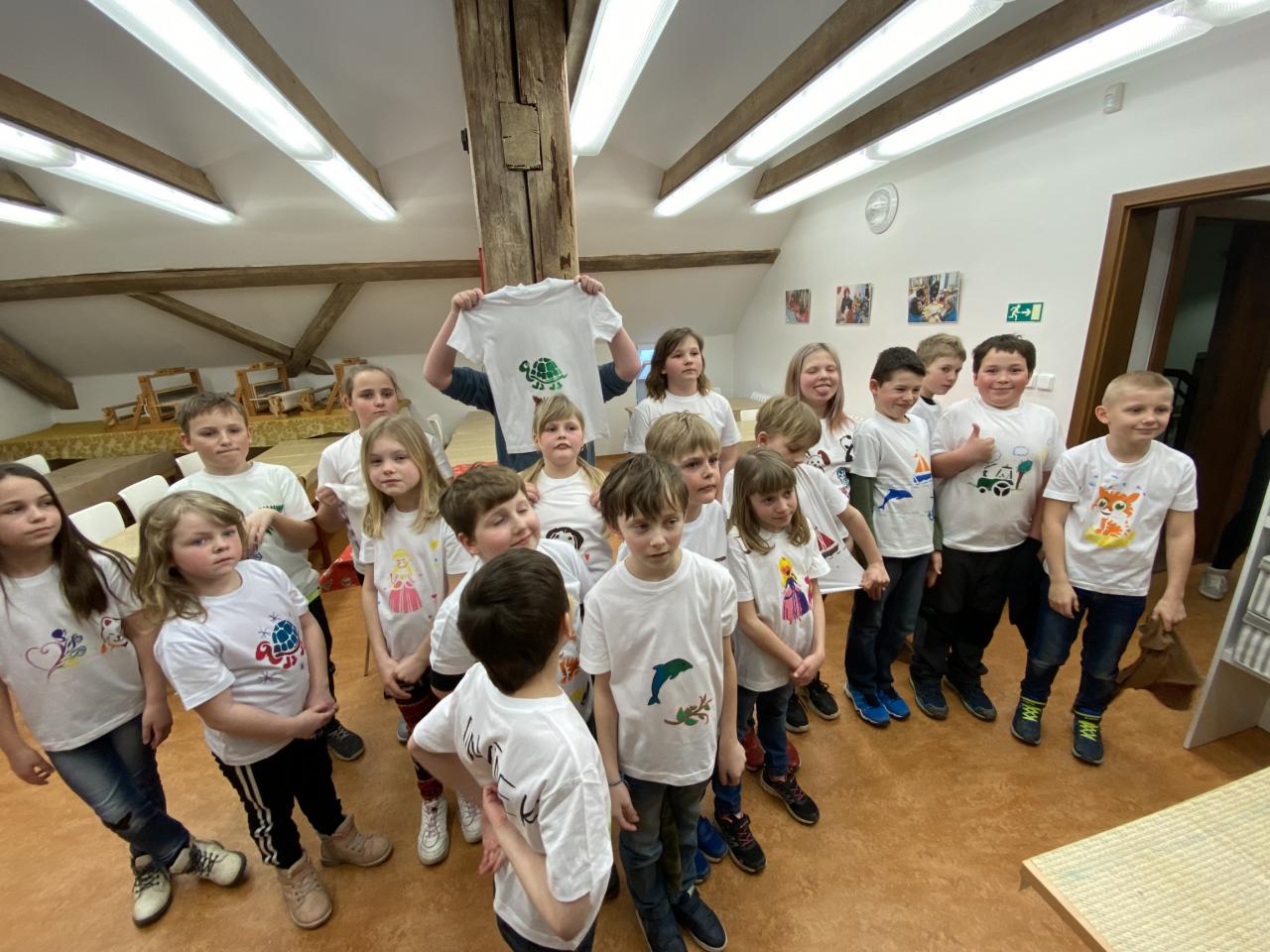 Seznámili jsme se s výtvarnou technikou tupování na textil, každý si sám ozdobil tričko, barvu vysušil a paní lektorka jí zažehlila. Trička všem moc slušela, děti dostaly sladkou odměnu a na závěr jsme si prohlédli restaurátorskou dílnu, paní restaurátorka nám představila svoji práci a ukázala dětem staré gobelíny.