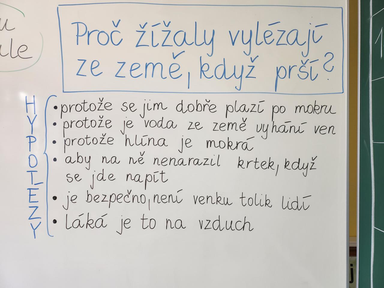 Dnešní čtení v první třídě se proměnilo v malé vědecké dobrodružství. Při práci s textem o žížale zazněla zvídavá otázka: Proč vlastně žížaly vylézají ze země, když prší? A bylo jasno – máme před sebou záhadu hodnou opravdového bádání!