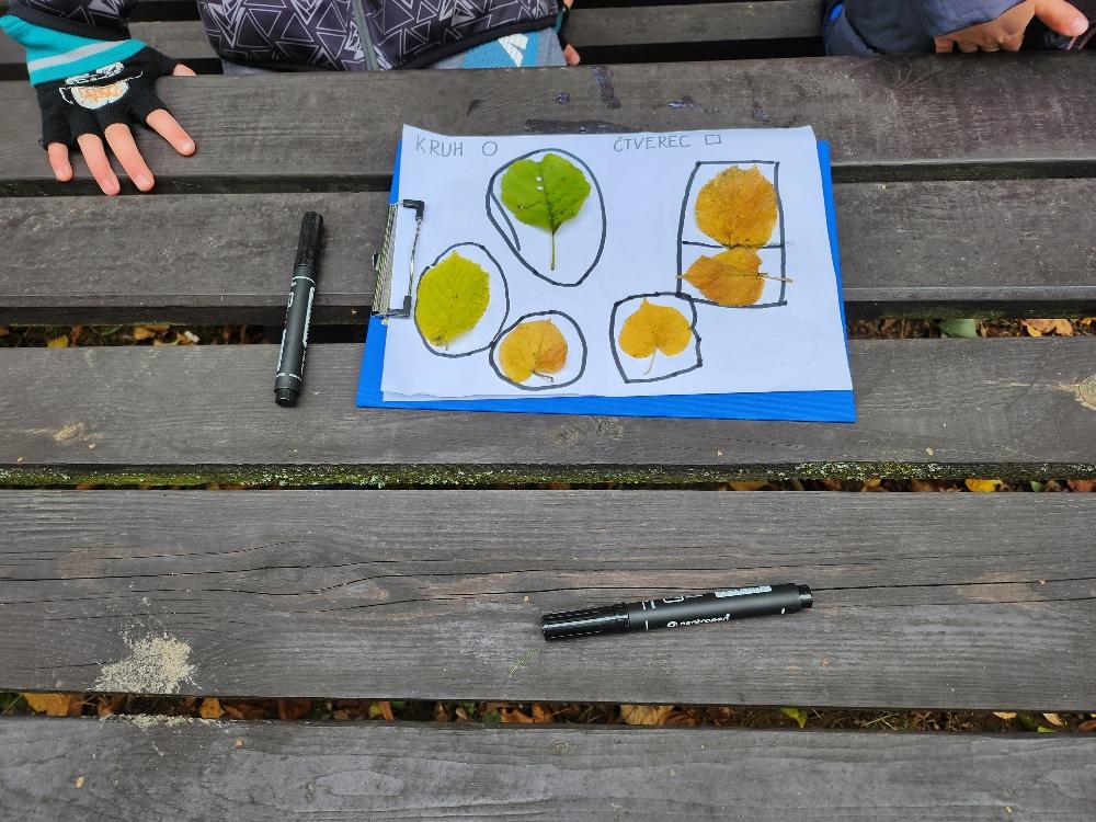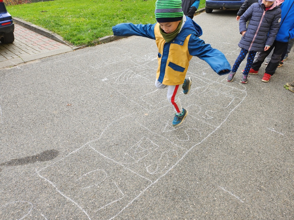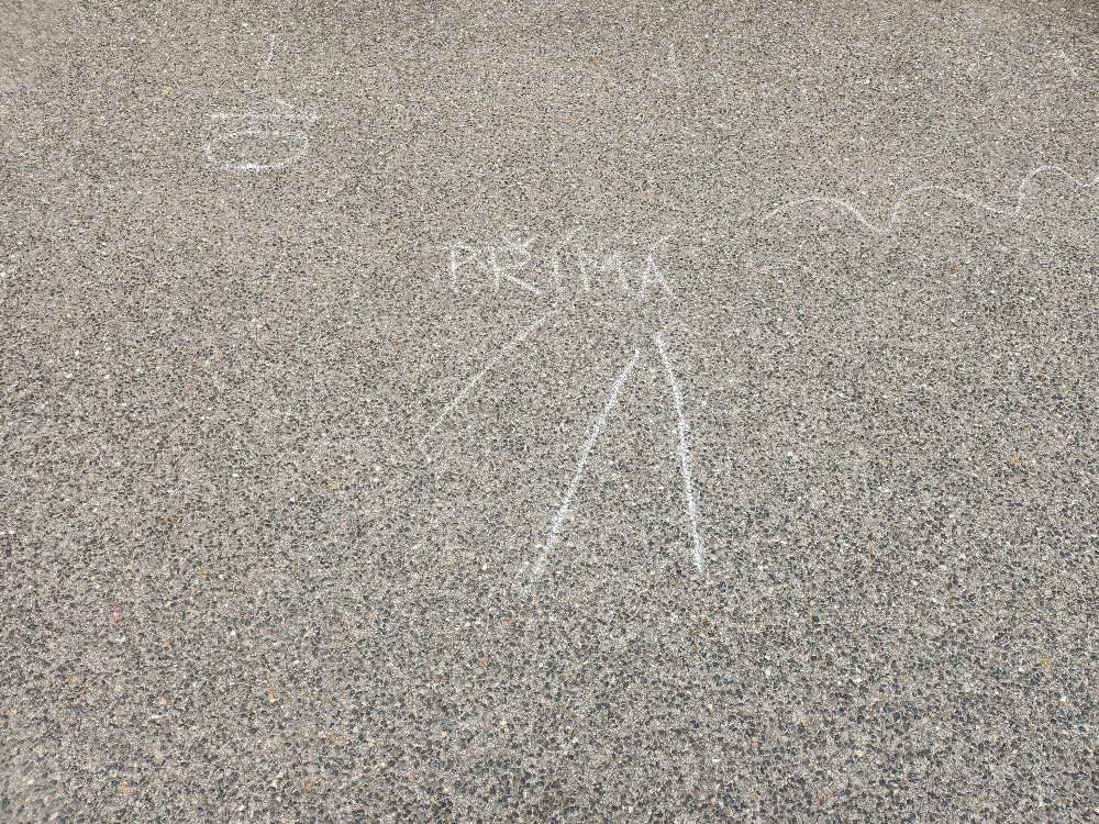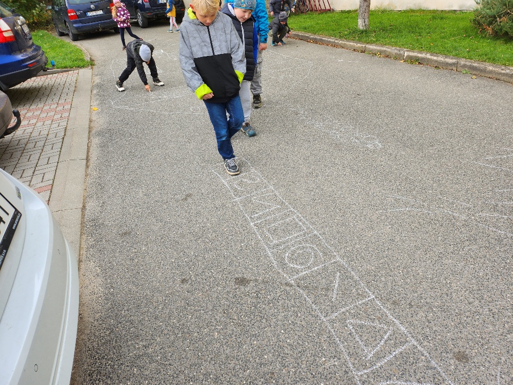 Prvňácči a druháčci dnes procvičovali geometrické tvary a ve dvojicích hledali listy připomínající dané tvary. Poté prvňáčci kreslili křídou slabiky SA, SO, SU, LA, LO, LU a při skákání panáka je četli. Druháčci stejným způsobem opakovali druhy čar.