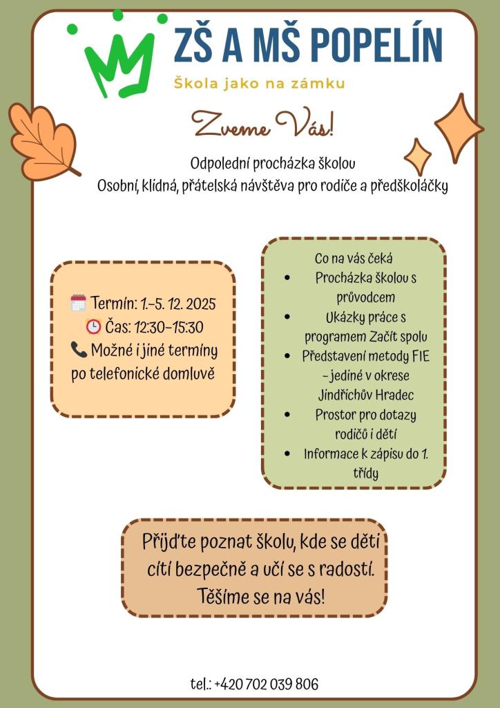 zveme vás na osobní a klidnou procházku naší školou, během které poznáte prostředí, atmosféru i to, jak u nás děti tráví své školní dny.
